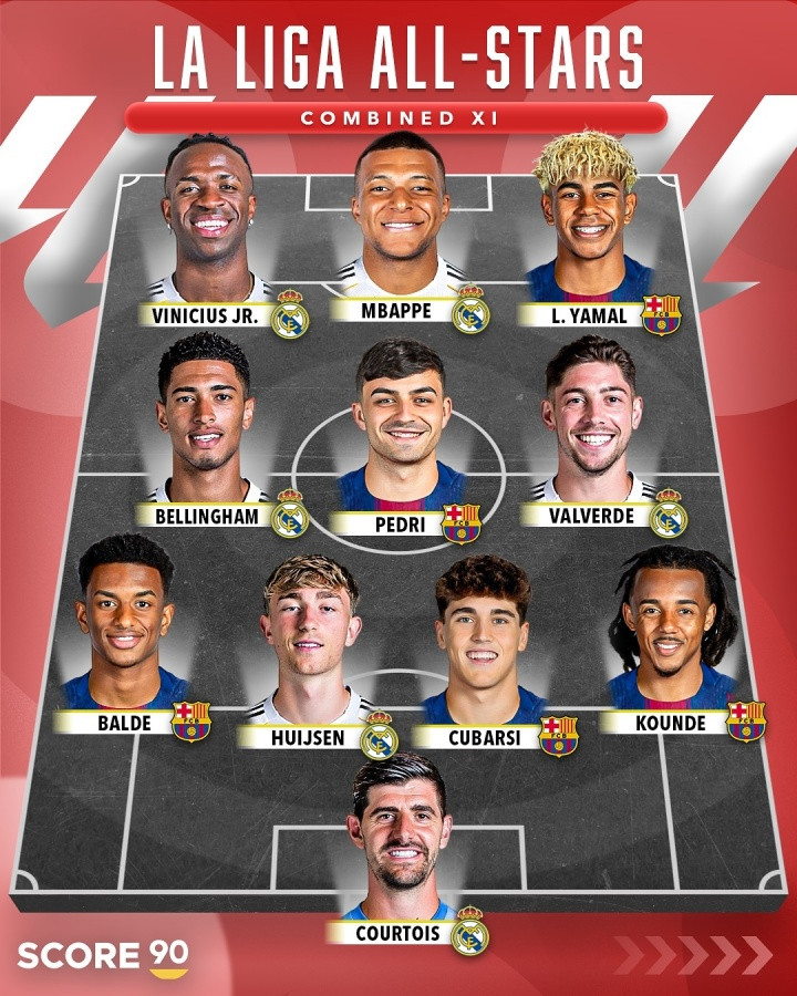直播吧08月16日讯外媒SCORE90列出西甲、英超全明星阵容,并抛出提问:西甲联赛对阵英超全明星,谁将获胜?